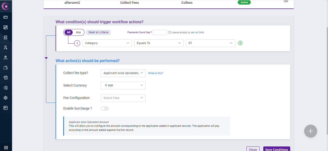 - Applicant-Wise Uploaded Amount (Workflow): In contrast, selecting "Applicant-Wise Uploaded Amount" as the workflow option allows for conditional adjustments in Fee Connect. For example, if a condition is set such as “Category equals to General”, only applicants in that category will see the specific amount assigned to them during profile creation at checkout. This allows for flexibility, so each applicant’s payment amount can vary based on predefined conditions.