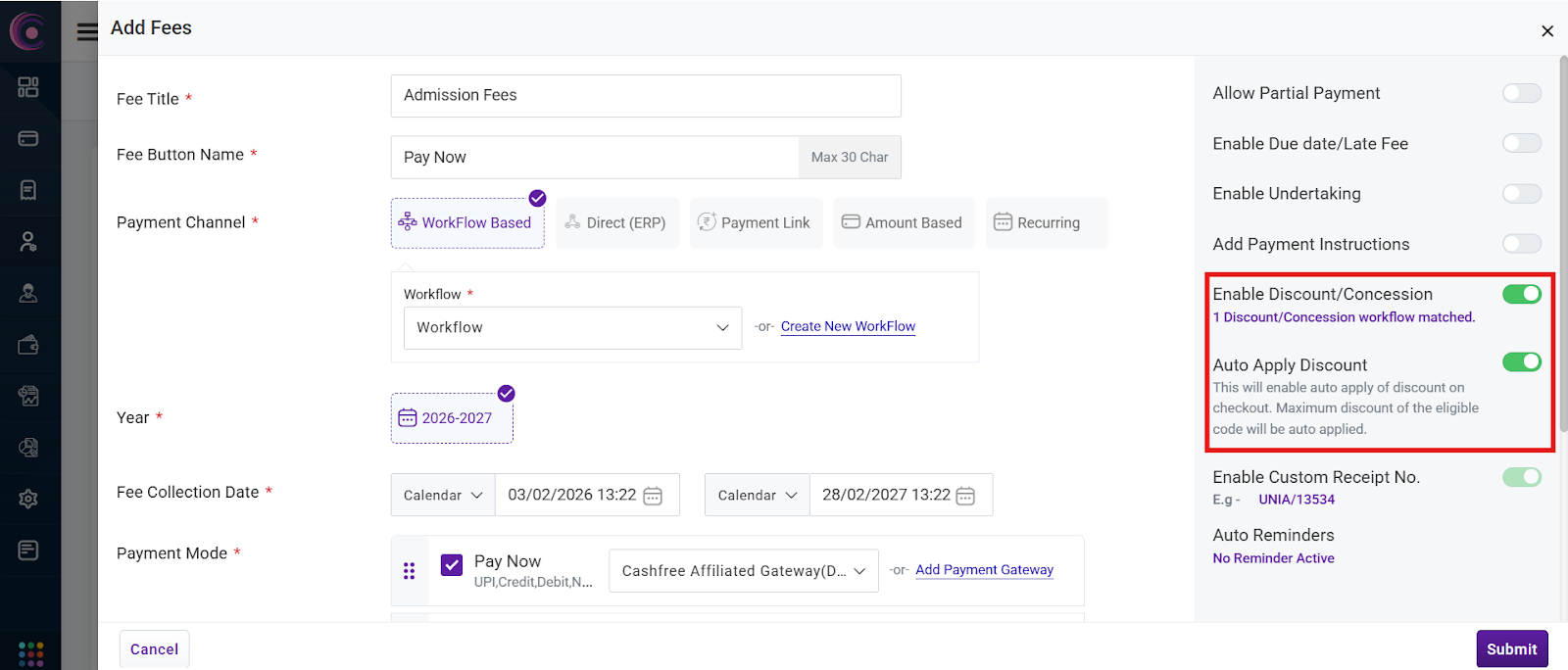 - Navigate to the fee where you want to enable auto-apply discounts. Edit the fee and turn on the Enable Discount/Concession toggle. This will make a secondary toggle, Auto Apply Discounts, visible - enable this to finally activate auto apply discount.