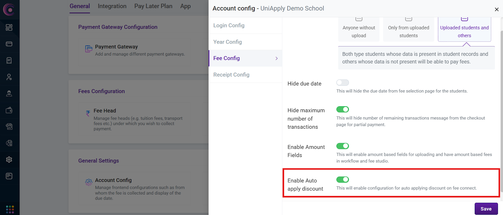 - Under Fee Config, enable Auto Apply Discount toggle.