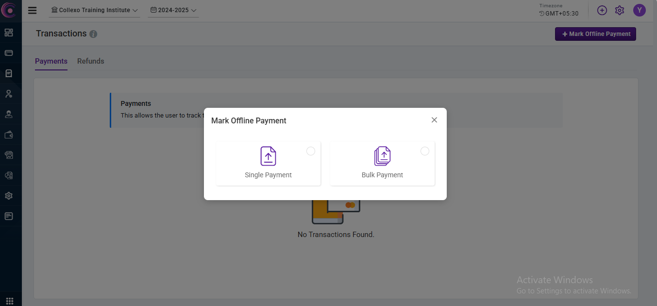 - After clicking on Mark Offline Payment, select the Bulk Payment option to begin the bulk upload process.