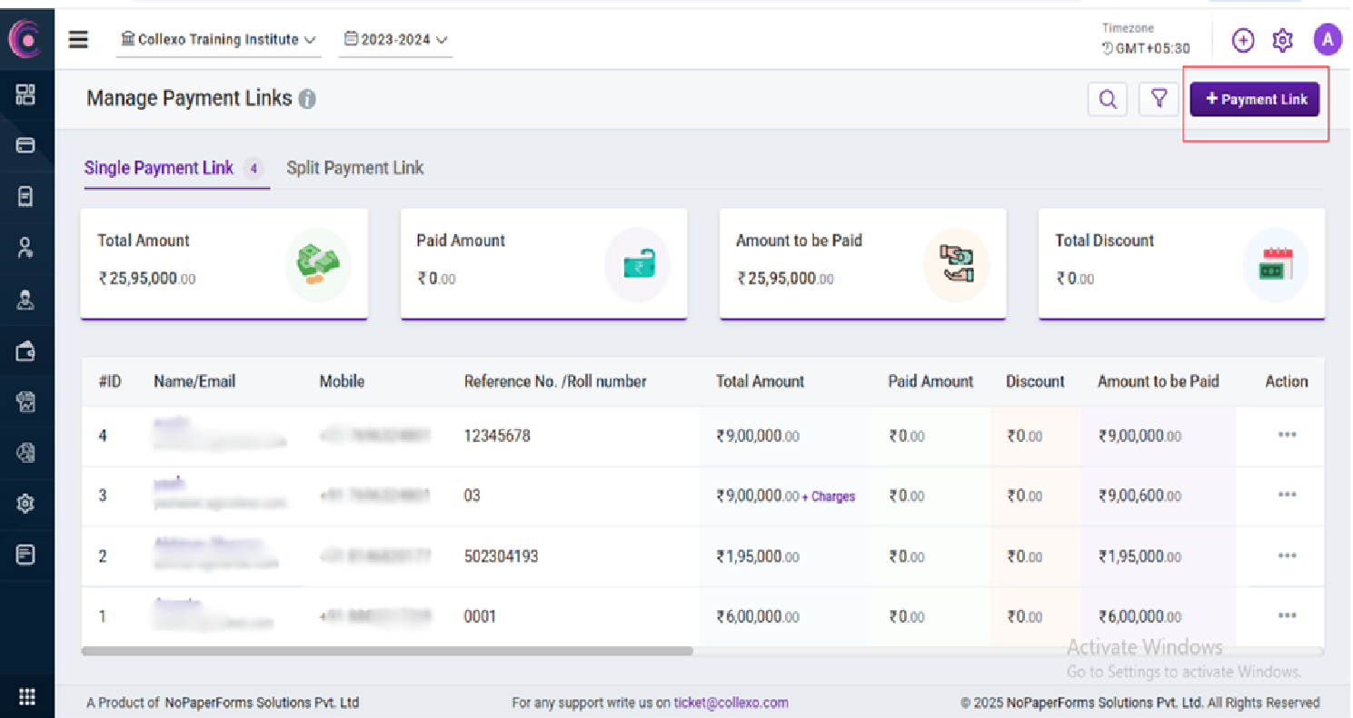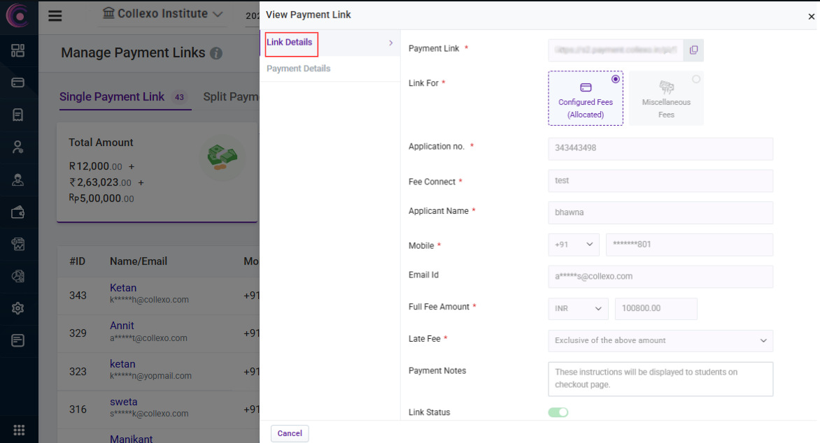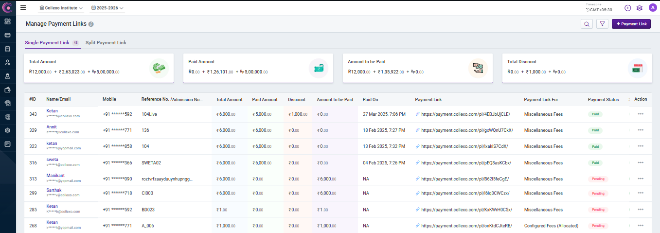 Overview Payment Links on Collexo can be broadly classified into 2 types:- Payment Links for Configured Fees:- These allow you to send links for fees that have been defined and assigned to students/applicants. These payment links require fees to be ...