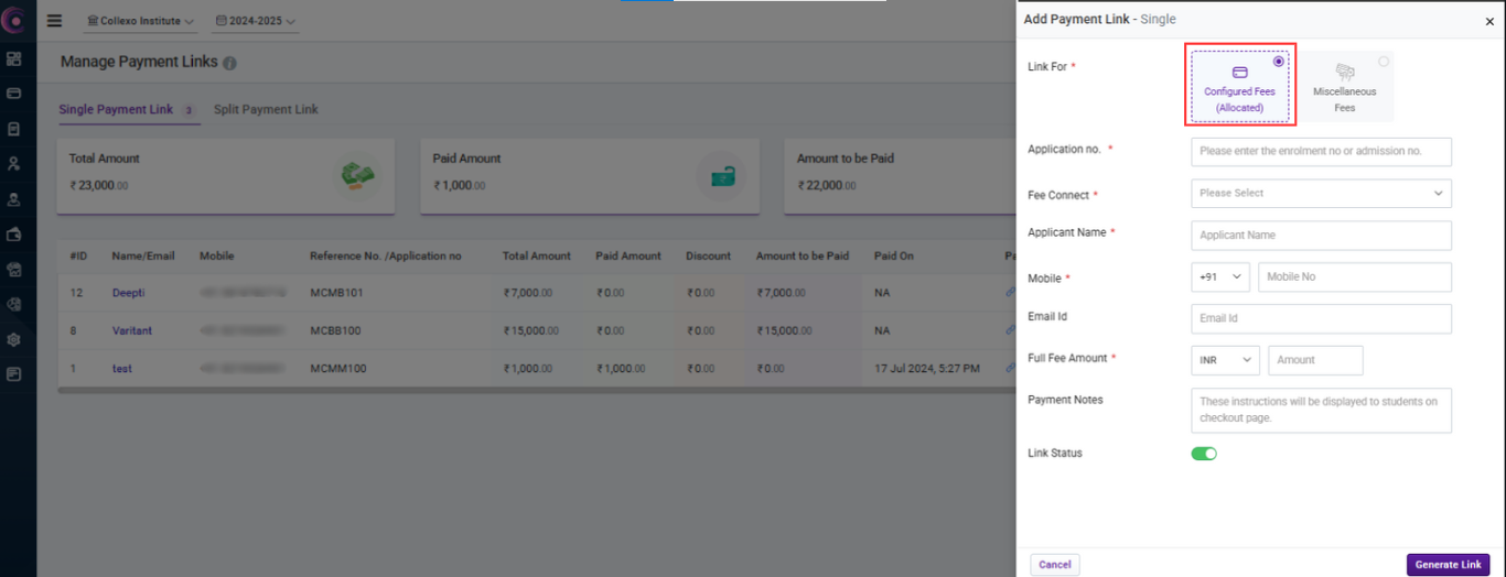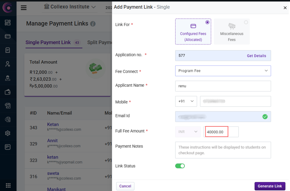 - After filling in all the required details, click on "Generate Link" to create and send the payment link to the applicant/student.