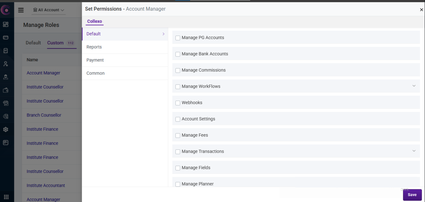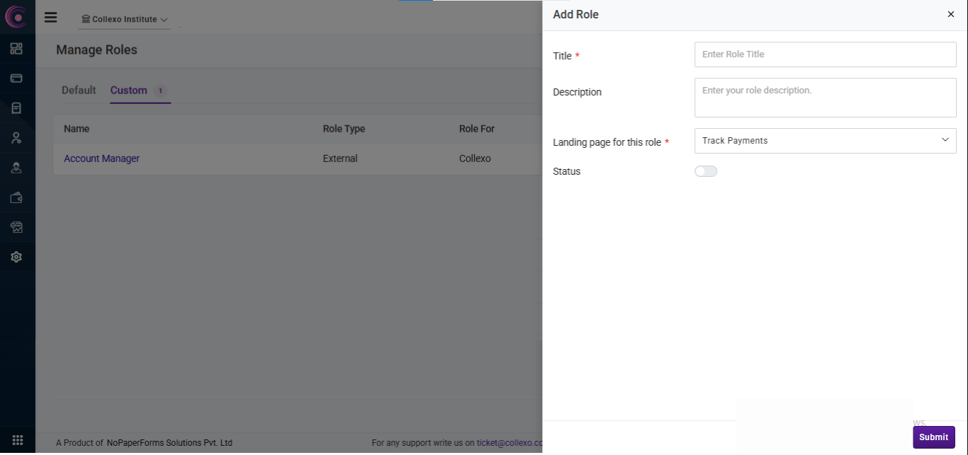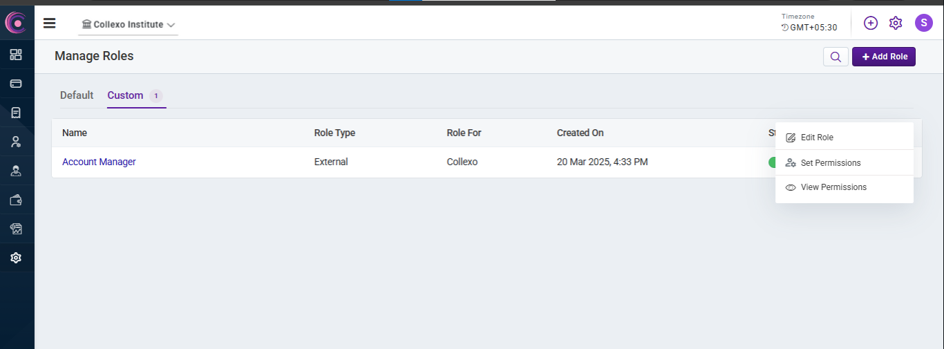 After filling in these details, the custom role will be created and will be shown in the Manage Role page in the Custom tab. You can then edit the role, set permissions, or view the permissions assigned to this role.