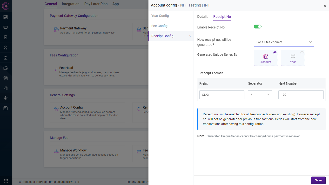 - For all fee connect: Receipt no. will be enabled for all fee connects (new and existing). However receipt no. will not be generated for previous transactions. The series will start from the new transactions after saving this configuration. This option is suitable for organizations that would want future payments to have a receipt number.