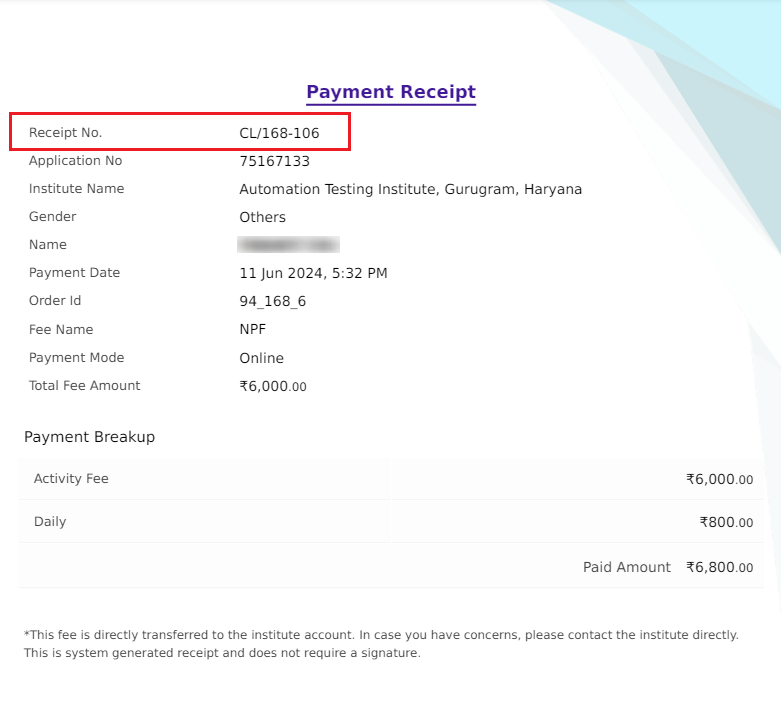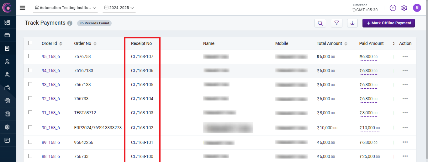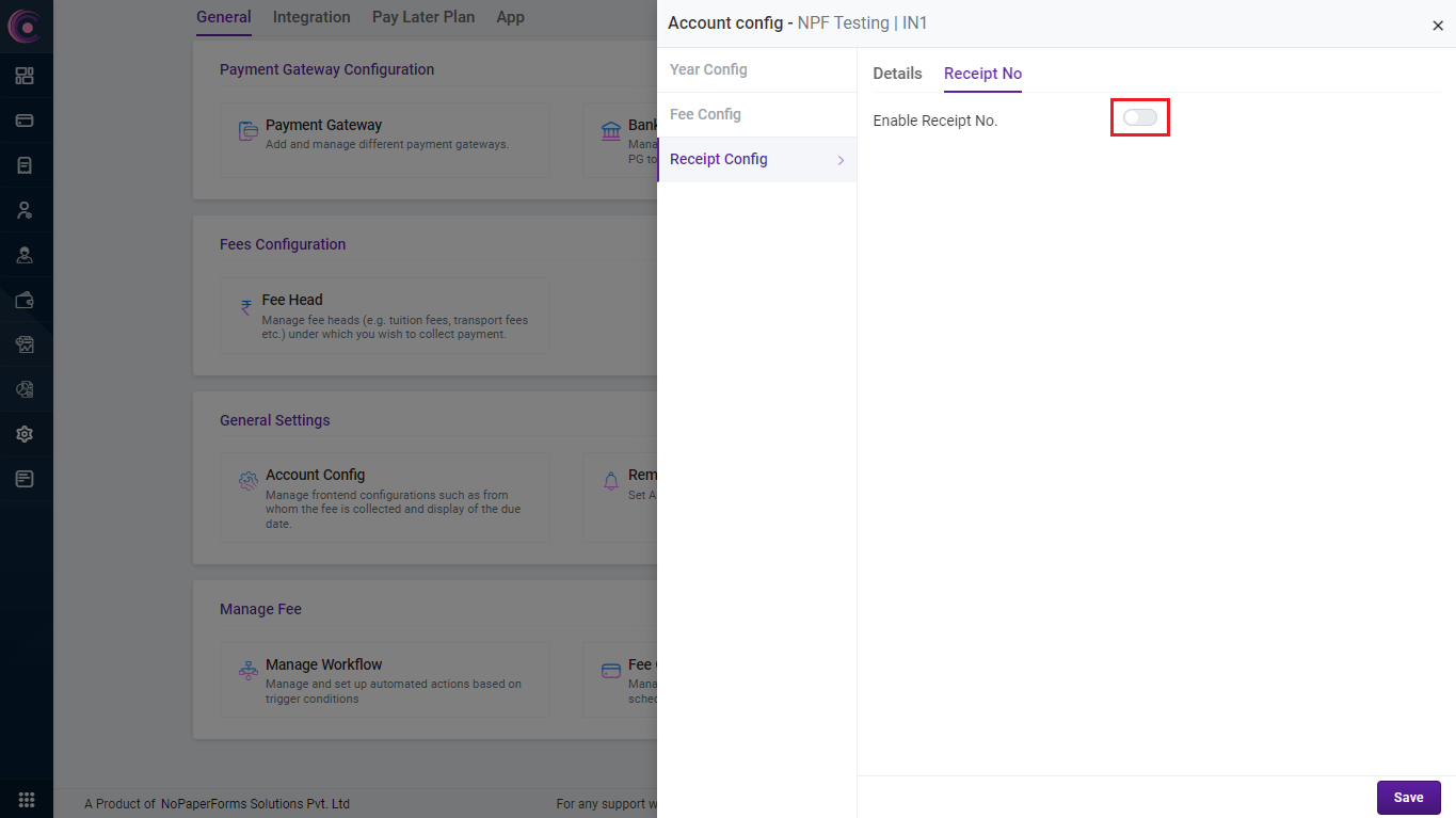 - After clicking on the "Save" button, the receipt number would get enabled for your organization.