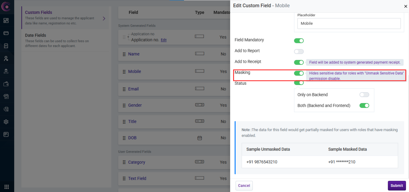- On the other hand, for custom fields, institute users with access to field configurations have full control over visibility. If they want to mask any Personally Identifiable Information (PII), they can easily do so by toggling the masking setting for each field from the “Manage Fields” page.