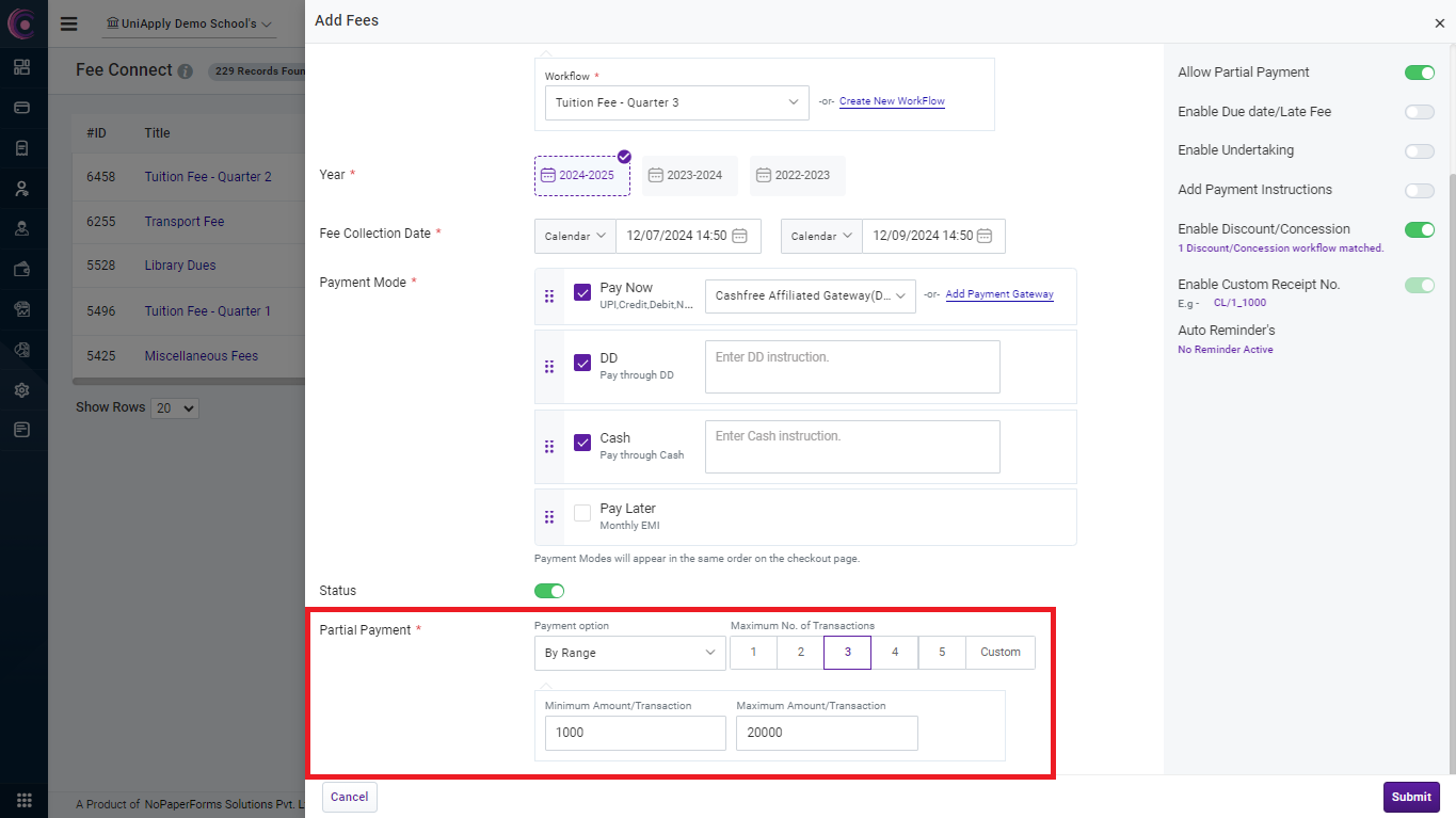 For utilizing partial payments, you need to first ensure that partial payment is enabled for the fee.
