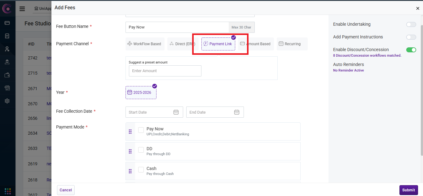 Setting up a Fee Studio for Payment Links allows you to collect one-time or ad-hoc payments efficiently. With options to customize payment details, modes, and reminders, the process becomes streamlined for both the institute and students. Additional features like undertakings and discounts offer further flexibility. Overall, it ensures a smooth and well-organized fee collection experience.