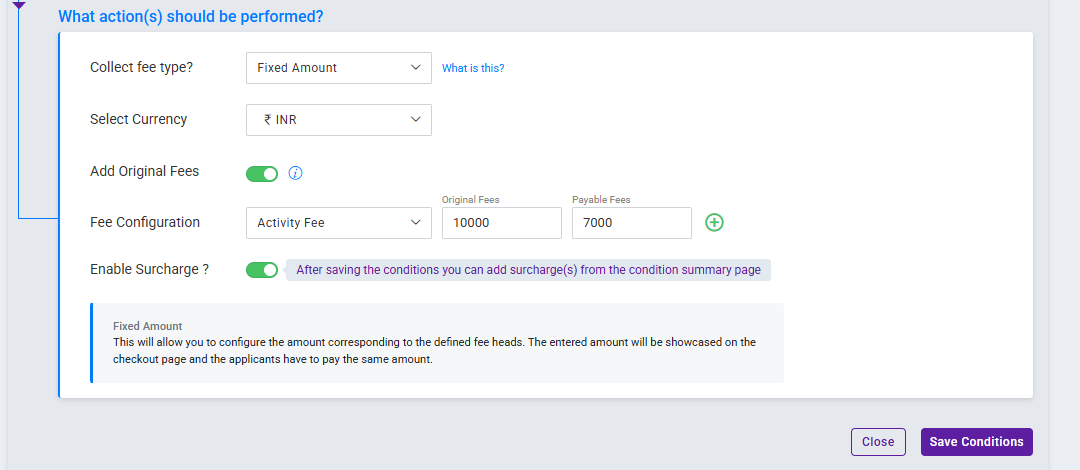 This fee type allows you to configure a fixed amount corresponding to defined fee heads. The entered fixed amount will be displayed on the checkout page, and applicants will need to pay that exact amount. That is, the amount you enter while creating a Fixed Amount workflow will be exactly what is shown on the applicant's checkout page.