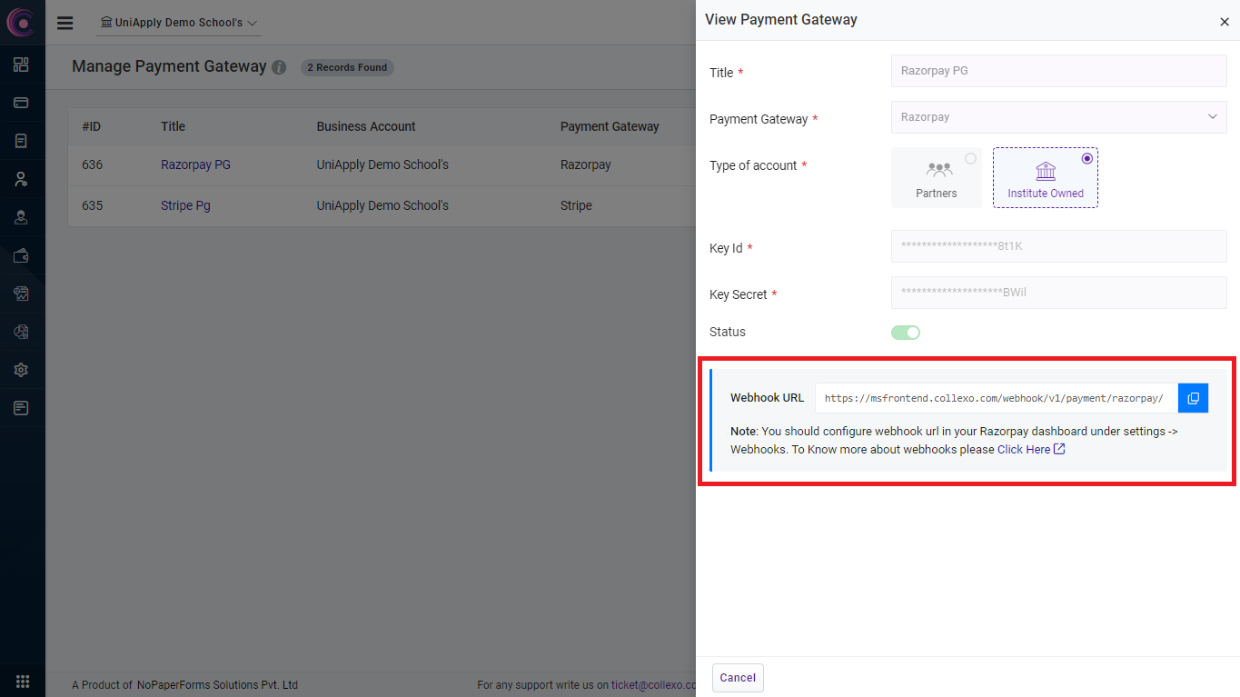After adding an institute-owned PG account, it is recommended to add Collexo's Webhook URL to the supported payment gateways' webhook configuration. The webhook URL can be found in the popup which opens after clicking on an added payment gateway's title. You may refer to the payment gateways' support material on configuring webhooks by clicking on the link available.