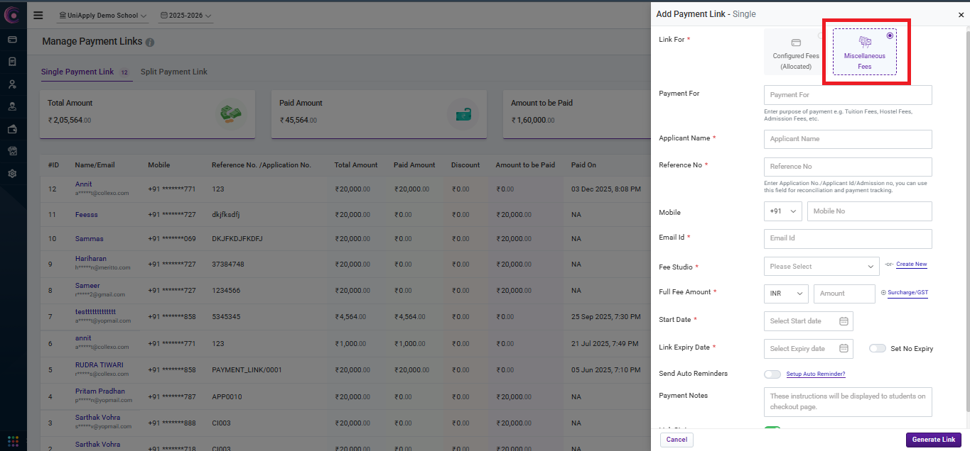 Miscellaneous Payment Links offer a versatile and efficient way to collect non-standard fees, such as exam charges or event registrations. With customizable features like automated reminders and flexible link expiry settings, this method ensures a smooth and streamlined payment process for both students and institutions