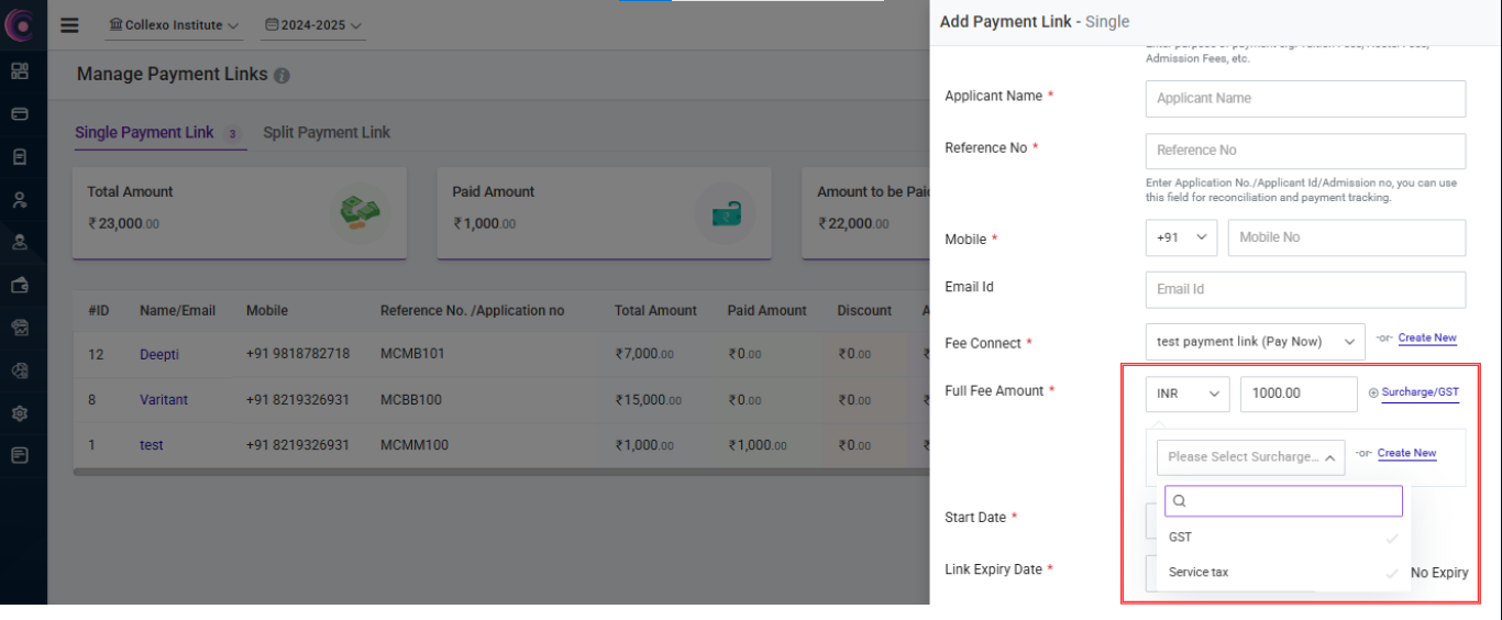 - Surcharge/GST: Select the surcharges that need to be levied to the final Amount. Only surcharges that are created in Manage Fee Heads can be selected. You can use it to collect taxes or any other additional charges from the student.