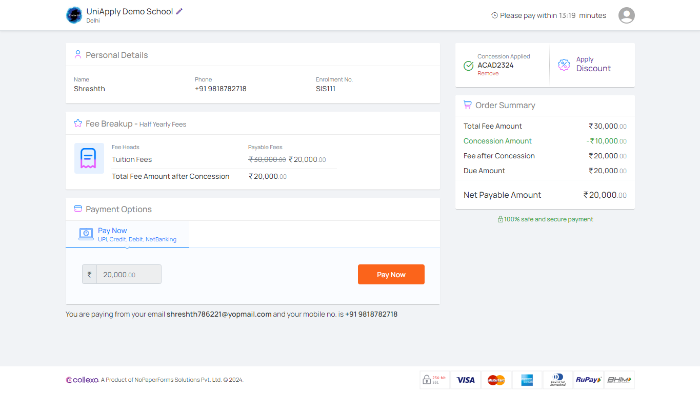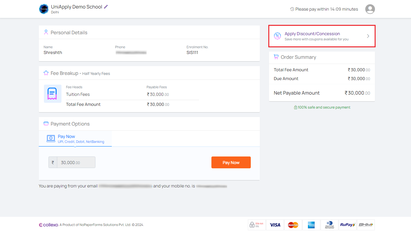After applying the available concession, the Net Payable Amount gets updated. The student/applicant can also apply available discounts after applying scholarships/concessions.