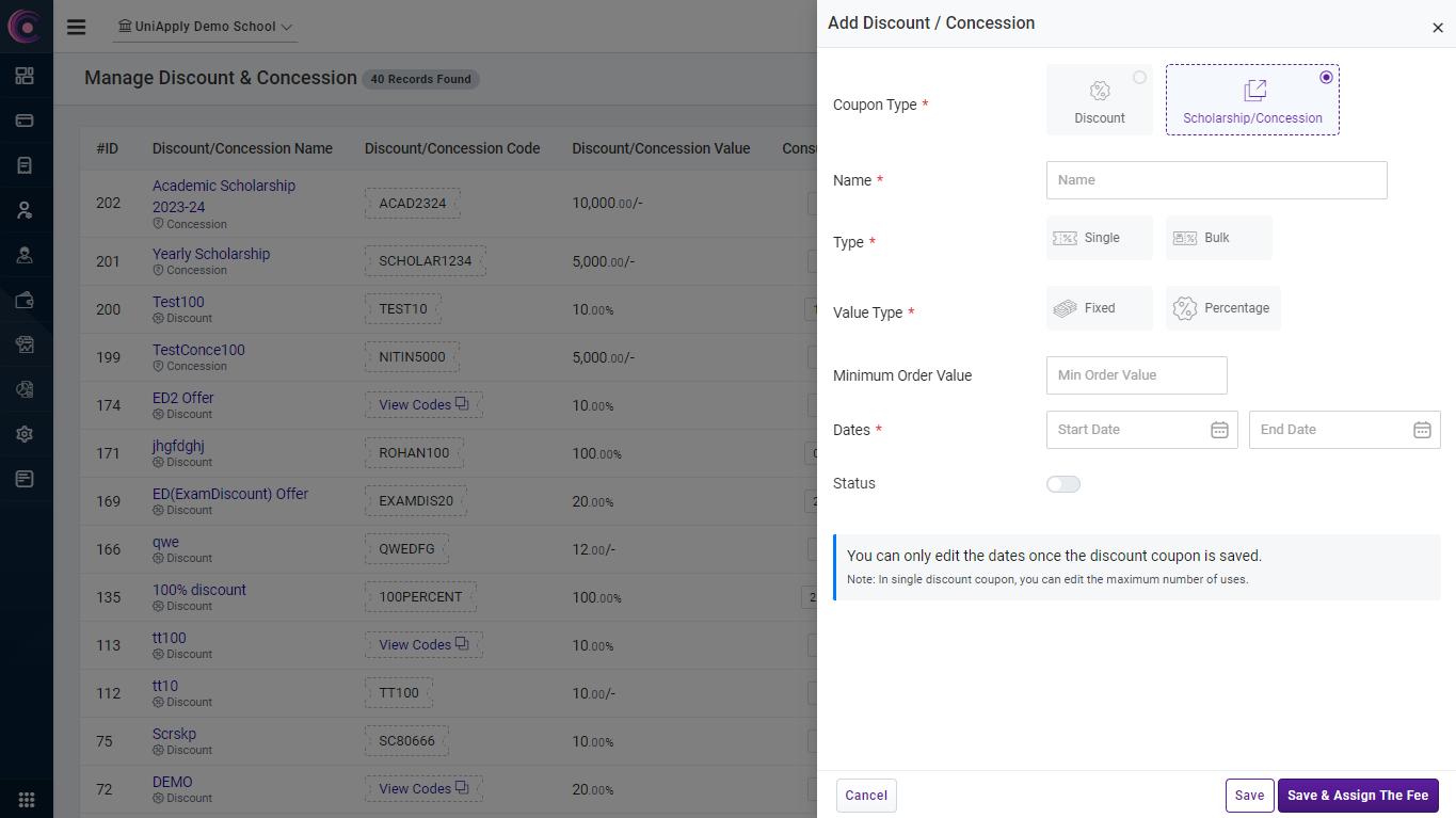 Once you've filled in the required fields, click on the "Save & Assign the Fee" button. This action will redirect you to the Discounts & Concessions Workflow page.