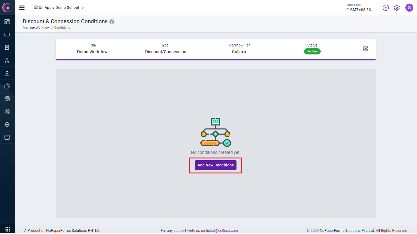 Click on the Add New Conditions button to configure conditions and actions for the workflow: