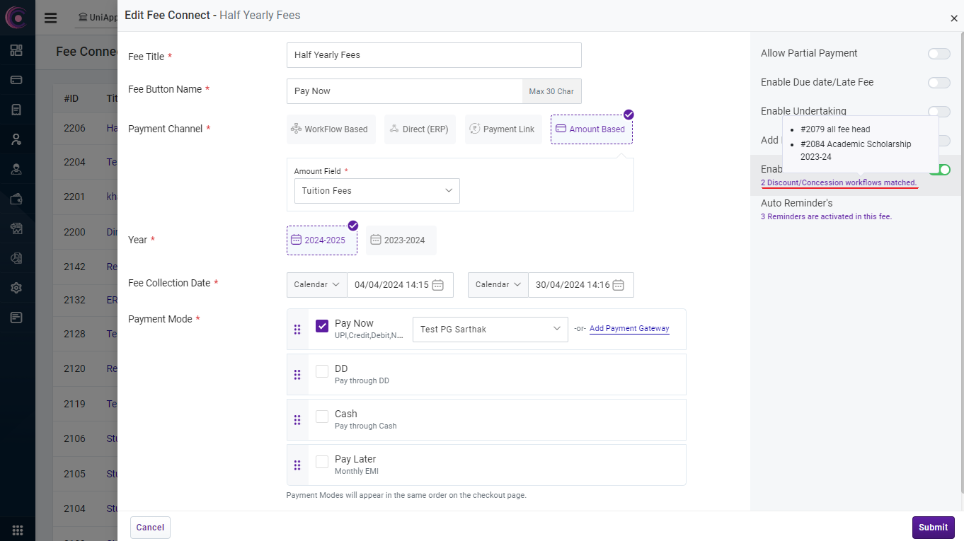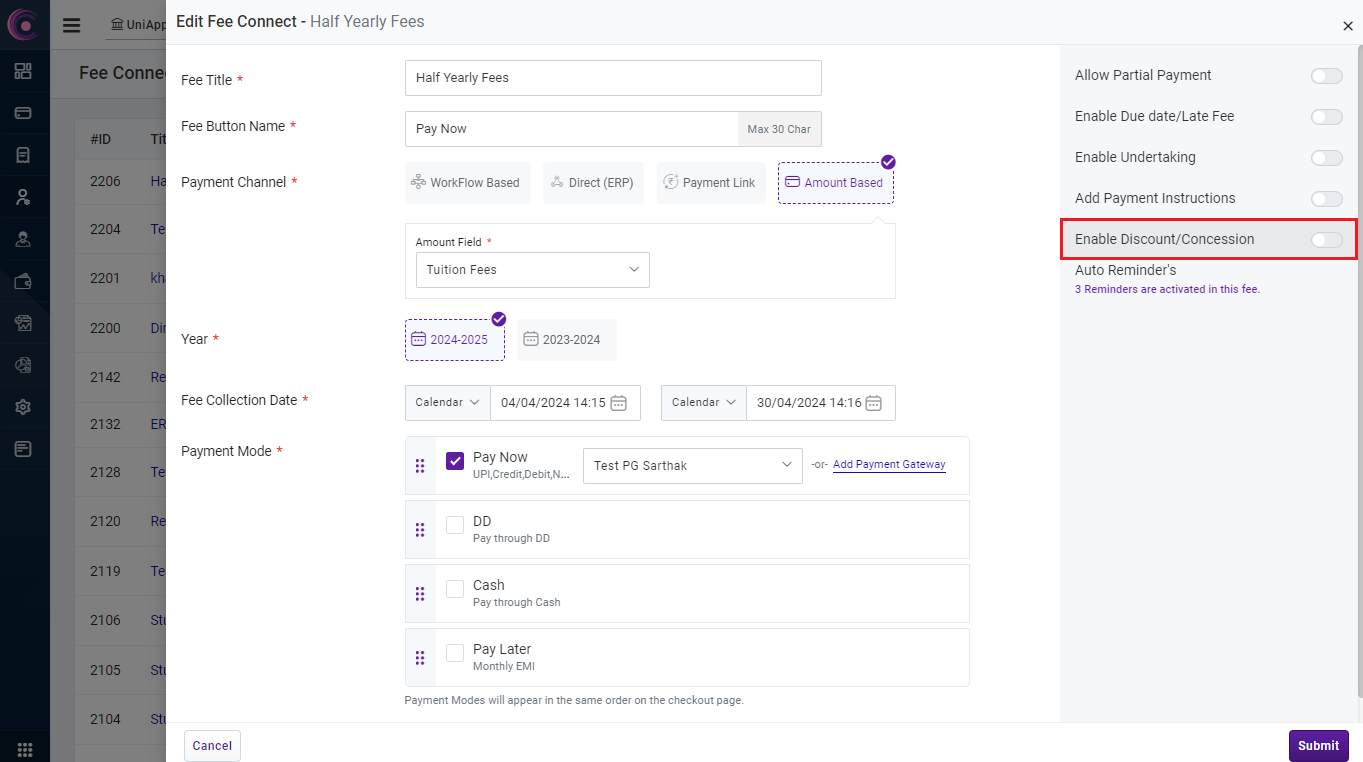 On the right-hand side, simply enable the toggle for "Enable Discount/Concession" to activate discounts/concessions on the fees.