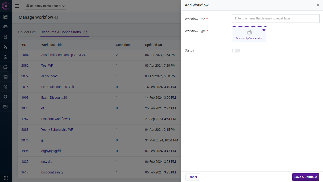 Associating a scholarship/concession with a workflow allows you to automatically assign that scholarship/concession to students/applicants or fees that meet the conditions set in the workflow.