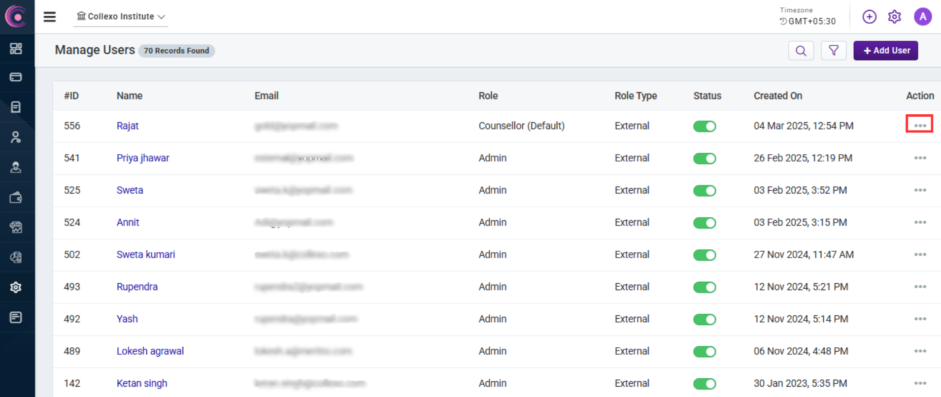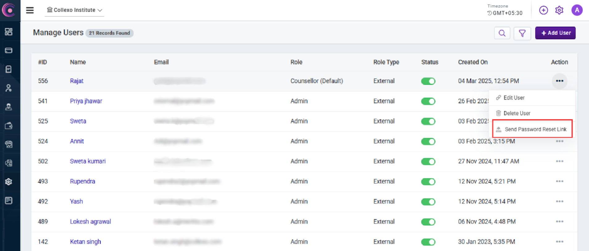 - Click on the Action button against the user to whom you want to send the Password Reset Link to.