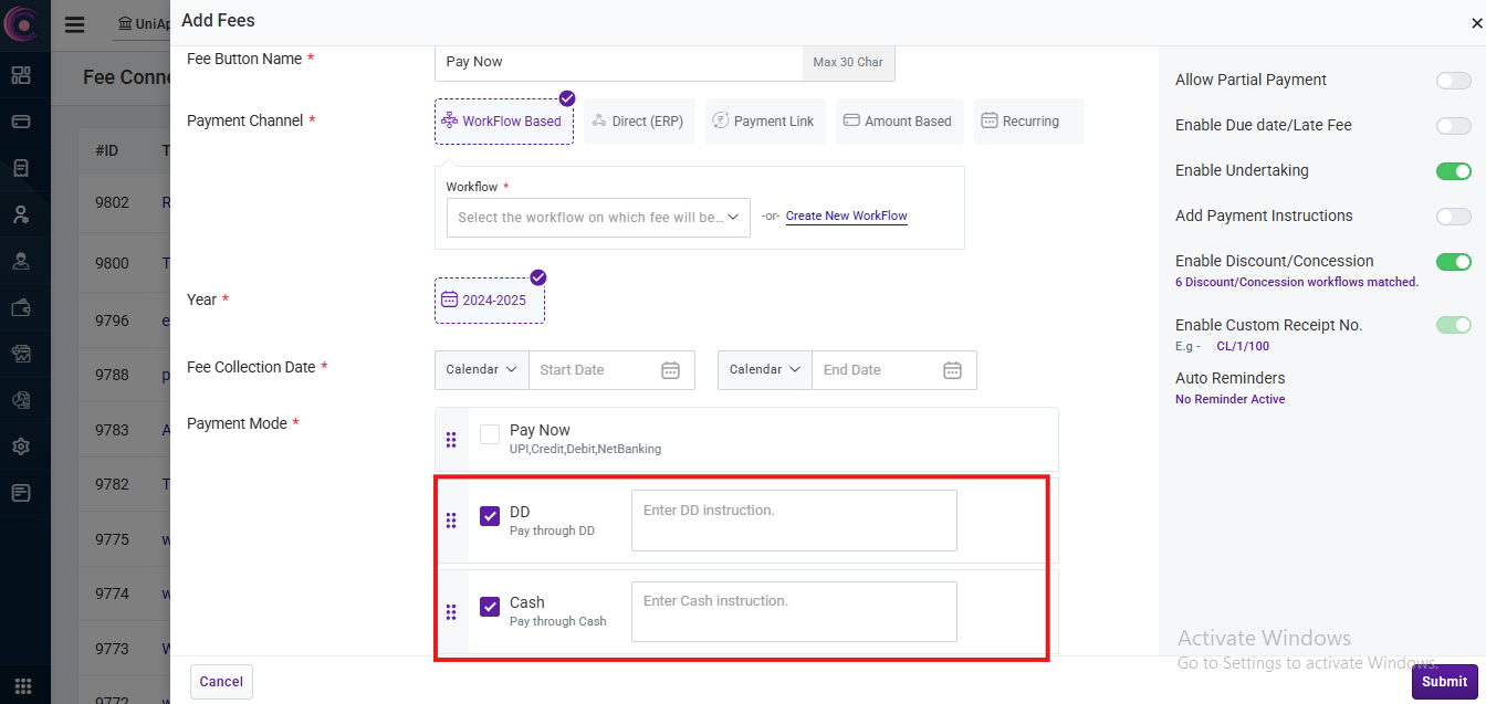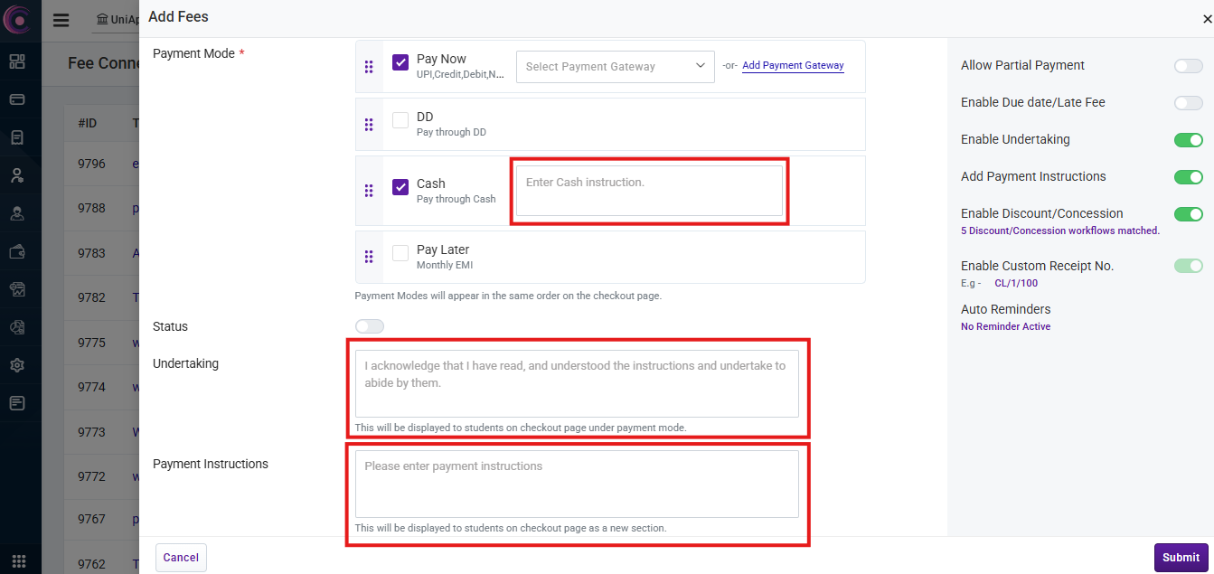 - Enable Undertaking: When this toggle is enabled, an undertaking checkbox will be displayed on the checkout page, and the applicant must check this box to proceed with the payment. A text field will appear in Fee Connect where you can enter the content of the undertaking.