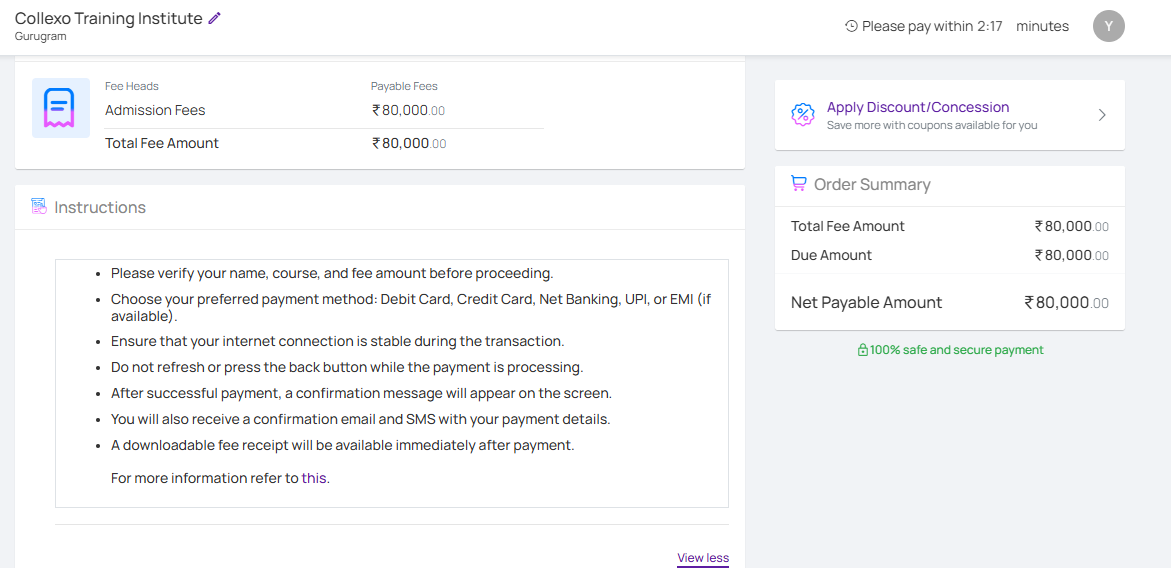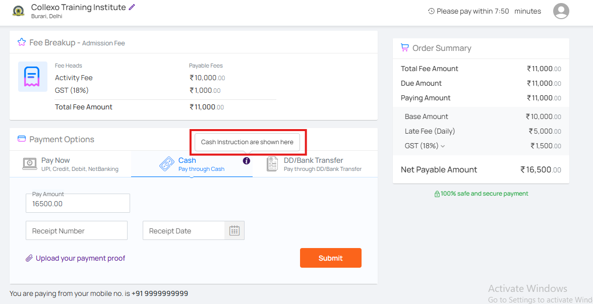 This field also supports HTML and inline CSS, allowing you to format the instructions with elements like bullet points, bold text, tables, or links to enhance clarity. For example, you can highlight account details, include a list of required documents, or emphasize important deadlines using basic HTML styling. - DD/ Cash Instructions: When DD or Cash is selected as the payment mode, an additional text field appears for entering specific instructions. These instructions are shown as a tooltip when users hover over the info icon next to the selected payment mode on the checkout page. This ensures applicants are aware of the necessary steps when choosing offline payment options.