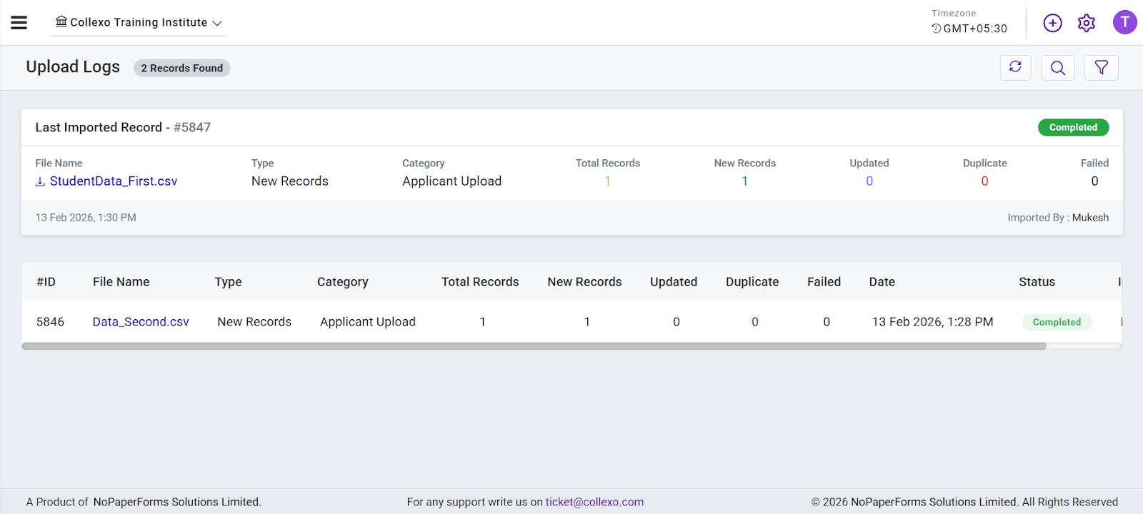 This page provides a clear and organized way to track bulk uploads, ensuring transparency in data management. Users can easily review upload details, track statuses, and download past records as needed.