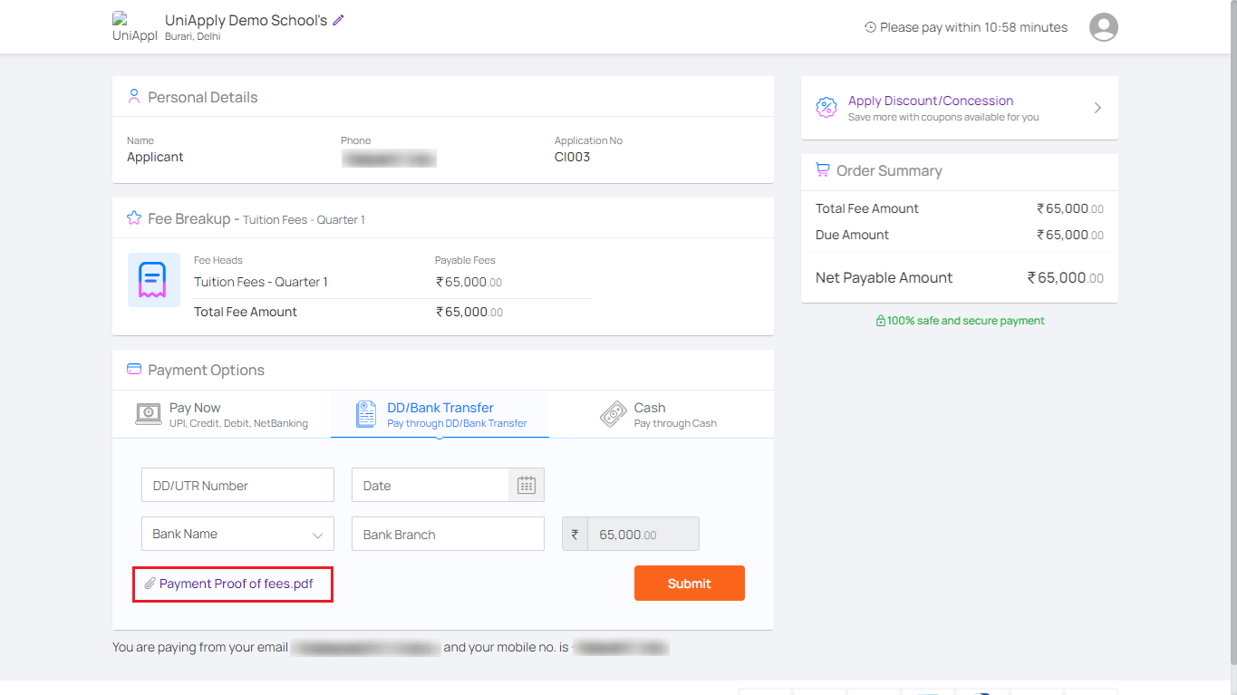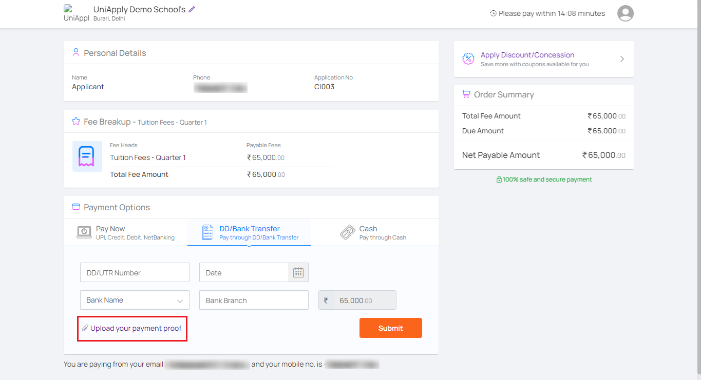 - Select DD/Bank Transfer or Cash among the available payment offline modes.