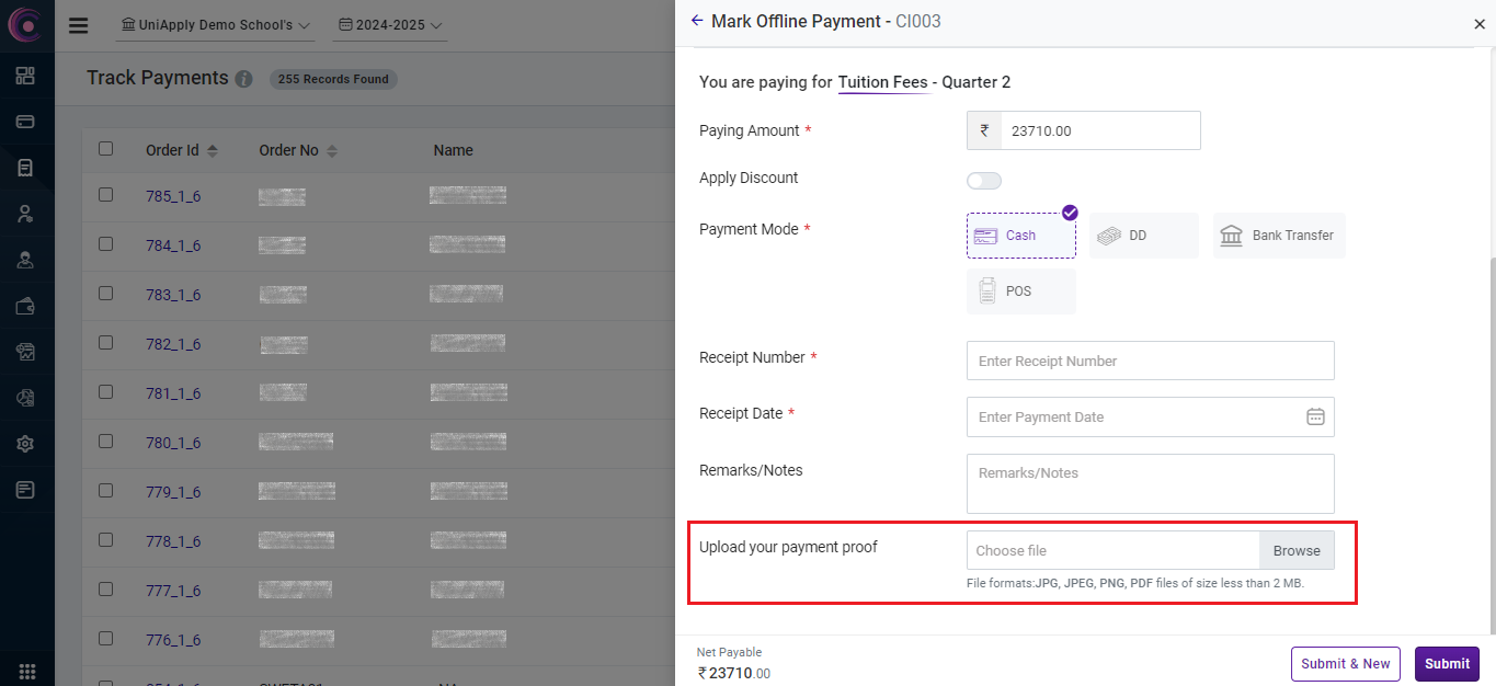 Here are the steps that you need to submit the payment proof whilst marking offline payments:-