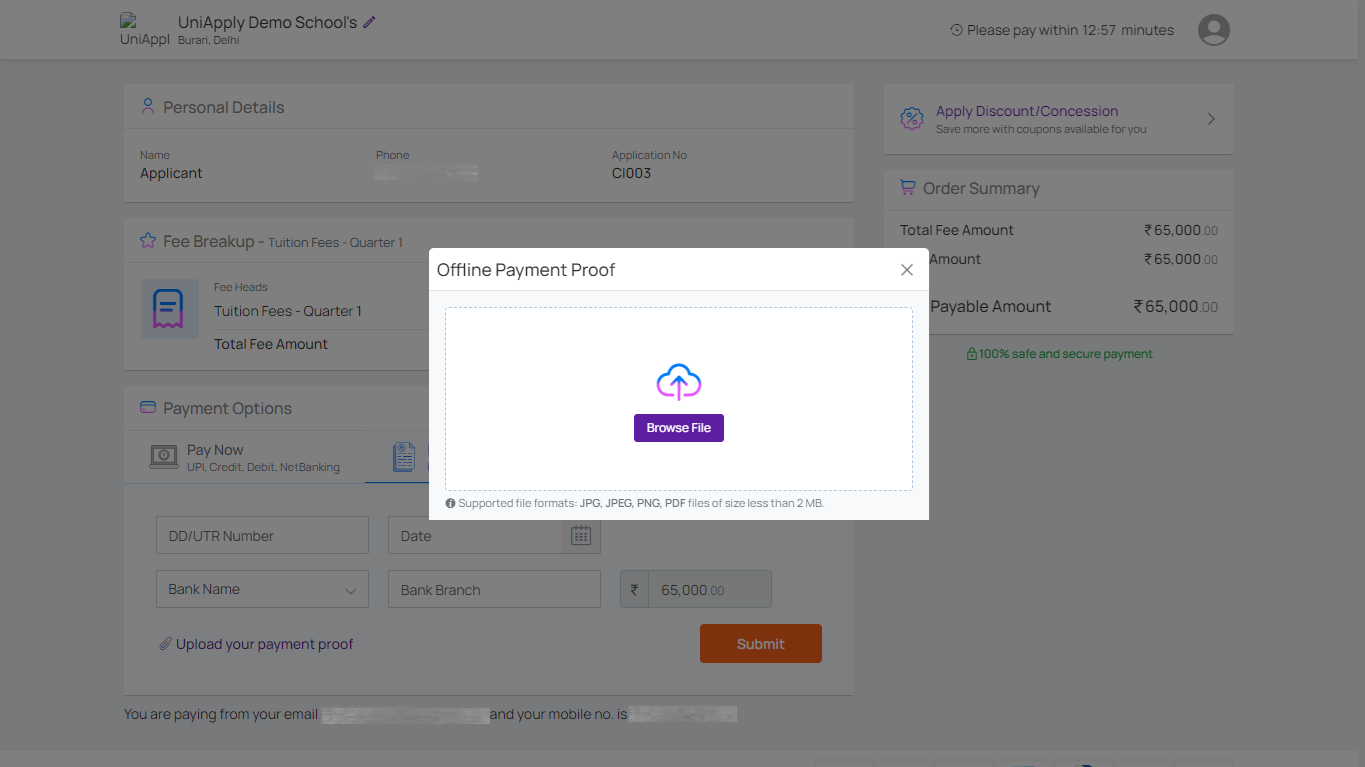 The option to upload payment proof would be visible to applicants while paying fees that have the offline payment methods - Cash and/or DD available.