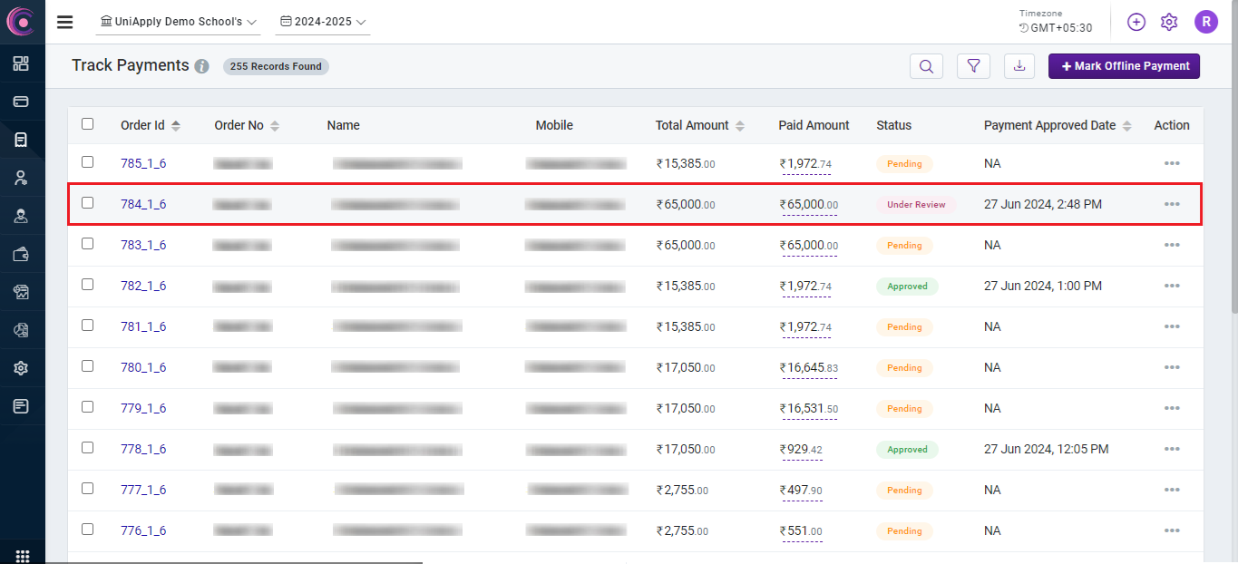 - Locate the payment that was made by the applicant using an offline payment mode. You may use filters for it.