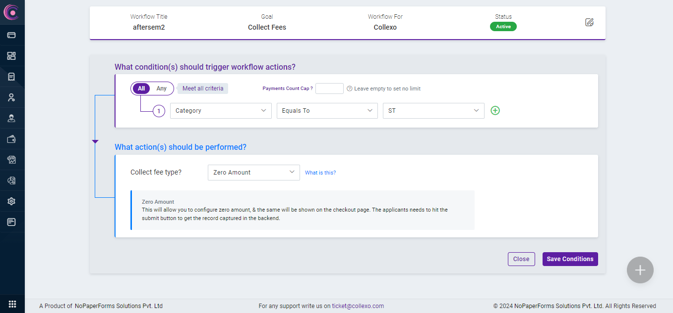 Collexo presently supports five distinct Fee Types within its workflow, designed to address a variety of use cases effectively. One of the fee types is "Zero Amount."